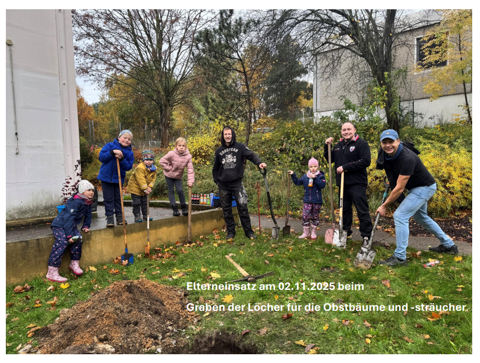 Herzlichen Dank für Ihr unglaubliches Engagement am vergangenen Wochenende. Mit Ihrer tatkräftigen Unterstützung haben Sie alle Löcher für unsere neuen Obstbäume und -sträucher gegraben. Die jungen Bäume finden einen festen Platz, die Sträucher bekommen eine gute Ausgangslage und unser Schulgelände wird lebendiger und grüner.