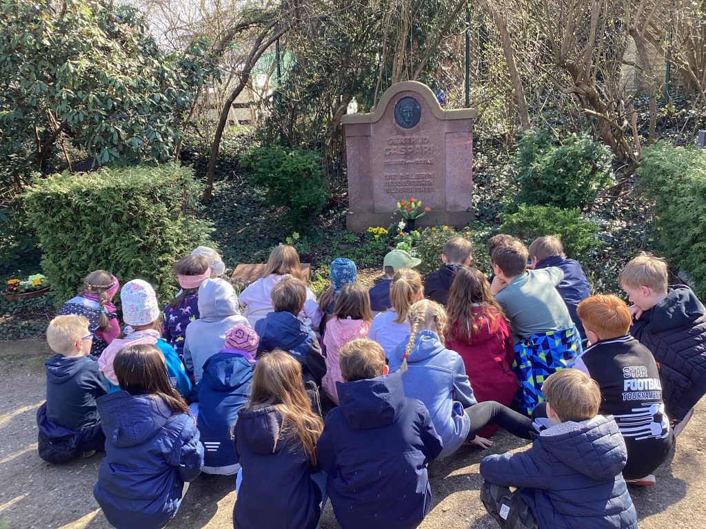 Auch in diesem Jahr pflegten Schülerinnen und Schüler unserer 2. Klassen anlässlich des Casparigeburtstages die Ruhestätte unserer Namensgeberin. Verschiedene Frühblüher sollen ihr Grab schmücken. Deshalb wurde zuerst die Erde gesiebt, bevor die Blümchen in die Pflanzschalen eingesetzt werden konnten. Nun sieht alles wieder schmuck aus.